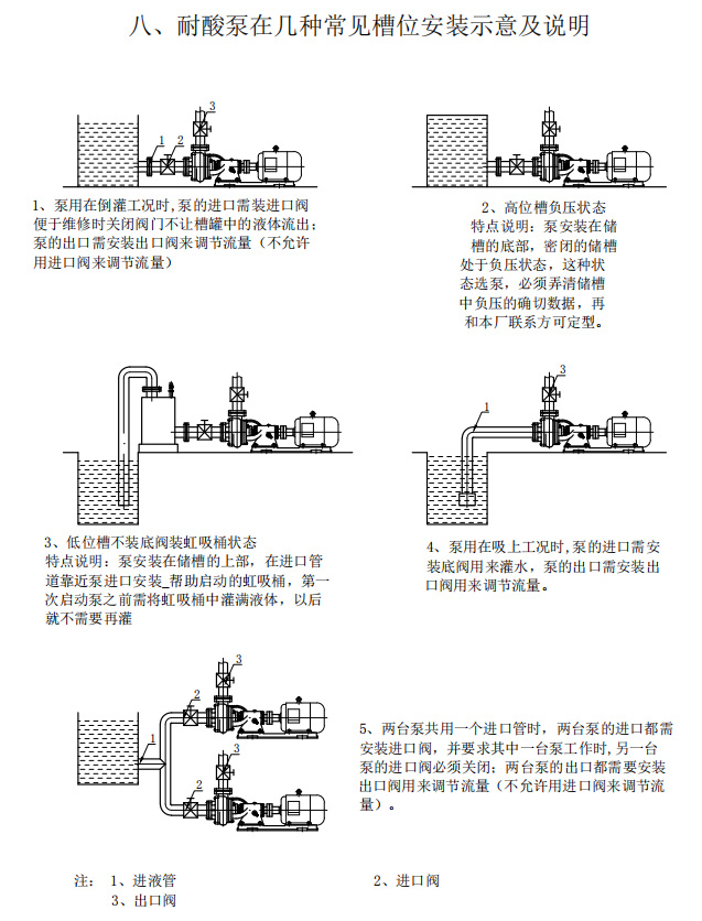 (8)泵在吸上工况下使用时,泵的出口必须装出口阀门:泵在倒灌工况下使用时,泵的进出口都必须装阀门。