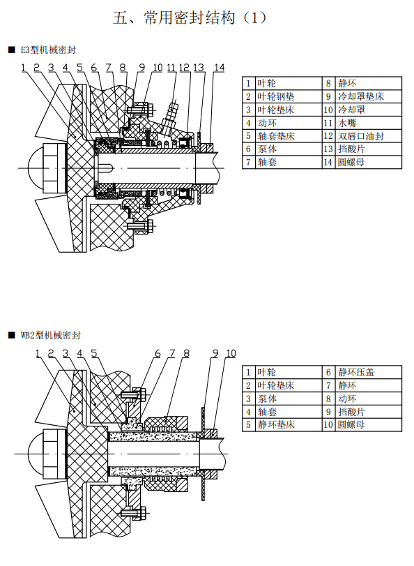(6)E3 型机械密封的泵在长时间不运转情况下,动、静环会粘结,盘车不动,此时不能强行启动,造成部件损坏,应拆开动、静环,表面用油脂润滑后重新安装。