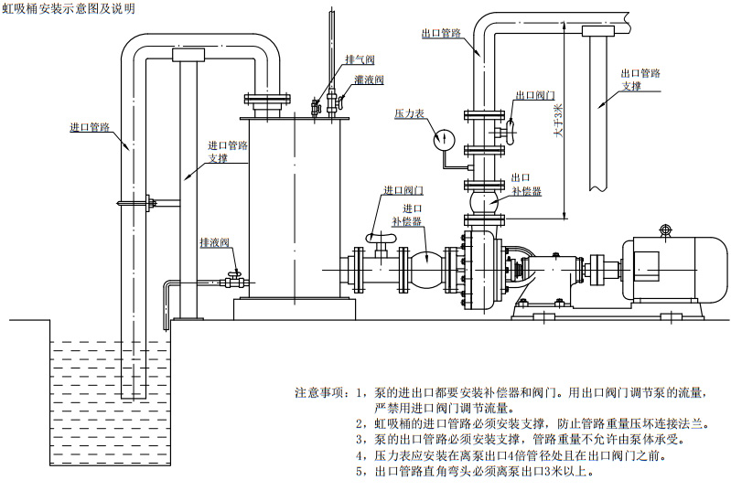 3、虹吸桶自吸效果降低时,应注意检查进口管路及虹吸桶的密封性, 确保不漏气、不漏液。