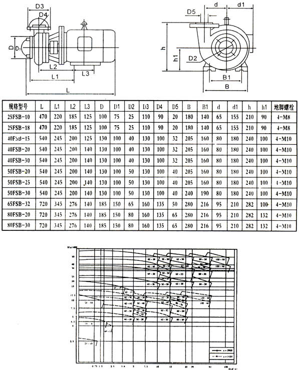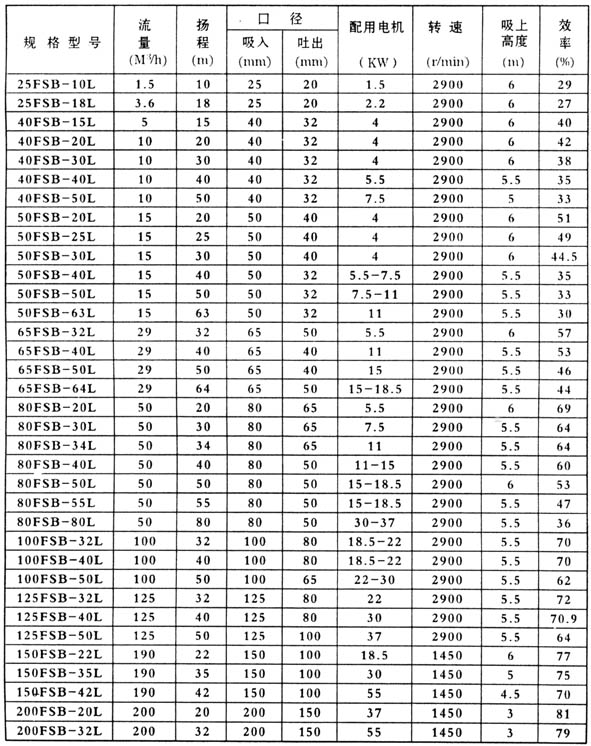 性能范围与型号说明:FSB-L型系列耐腐蚀泵,全系列共30个规格,流量范围1.5-200m3/时,扬程范围15-80m。